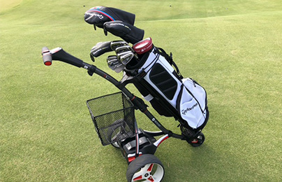 プレー快適性向上を目的とし、気軽にプレーを楽しめるトロリーカートを導入しております。軽量であるためグリーン周りまで走行が可能なことと、上り傾斜も電動のため、プレーヤーの負荷にはなりません。操作も簡単でスピード調整もできますので、ご自身の歩行スピードでご利用いただけます。